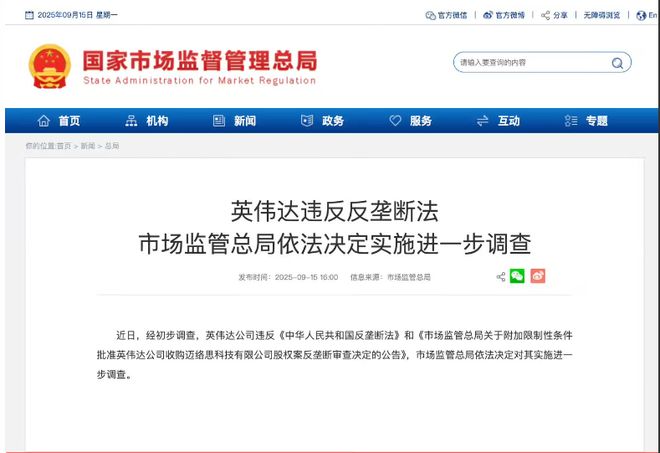 9 月 16 日消息,中国国家市场监督管理总局昨日称,近日,经初步调查,英伟达公司违反《中华人民共和国反垄断法》和《市场监管总局关于附加限制性条件批准英伟达公司收购迈络思科技有限公司股权案反垄断审查决定的公告》,市场监管总局依法决定对其实施进一步调查。